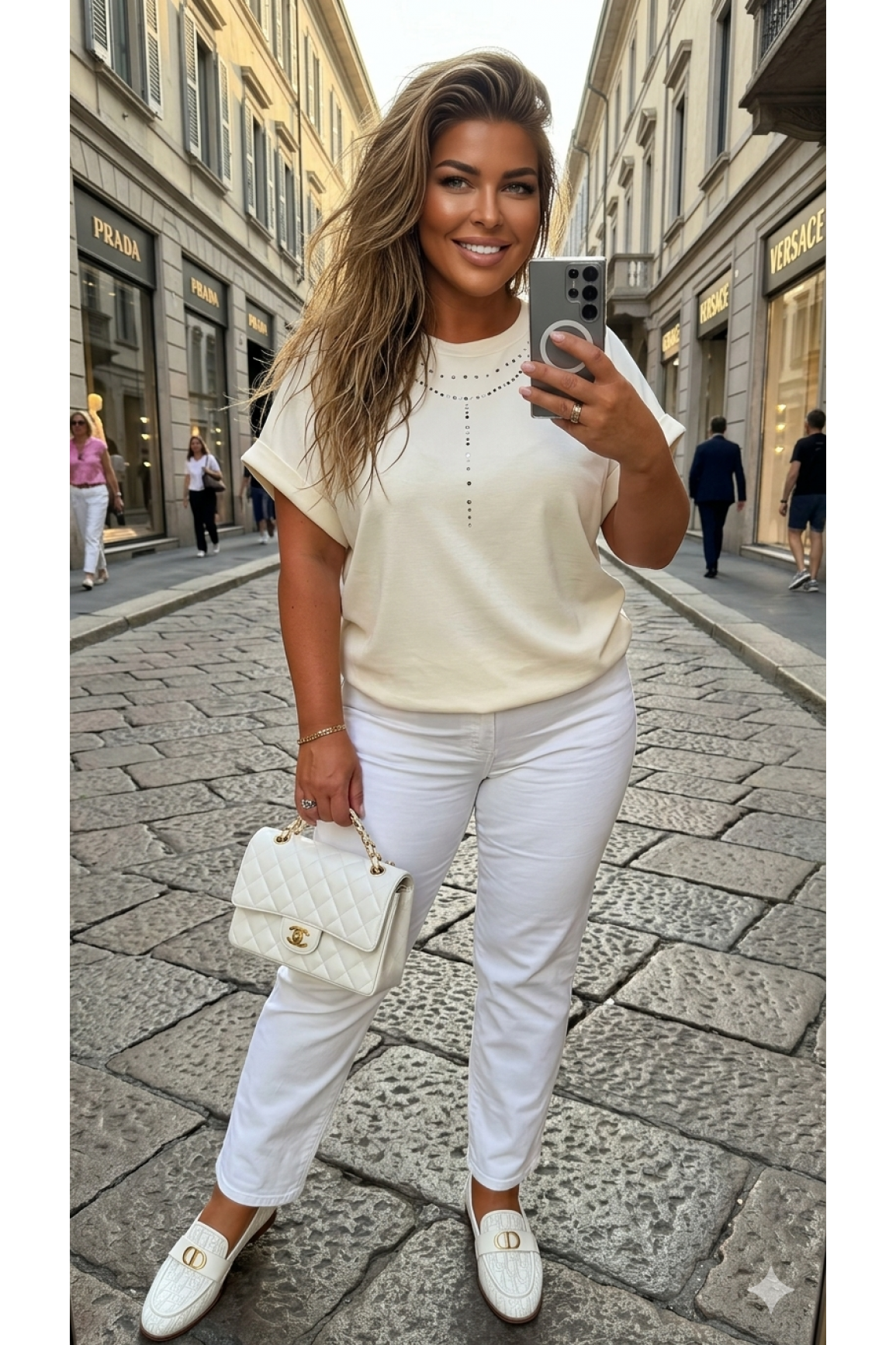 Состав: 60% вискоза, 35% полиамид, 5% спандекс. Блуза из трикотажа, немного расширена к низу, с цель..