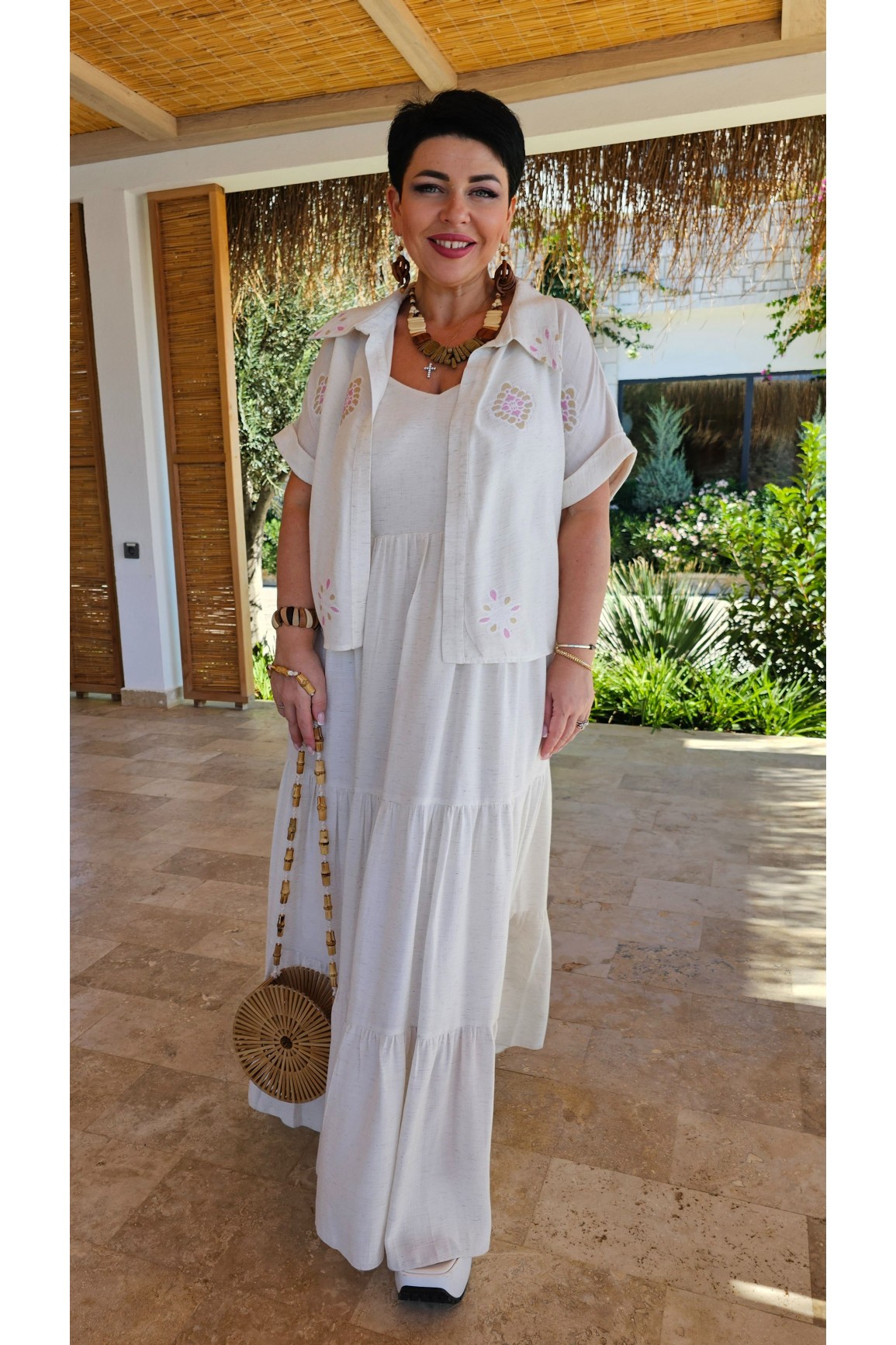 КупитьСостав: ткань верха 55% лён, 45% вискоза, подкладка 100% вискоза. Летнее платье белого цвета украшен..